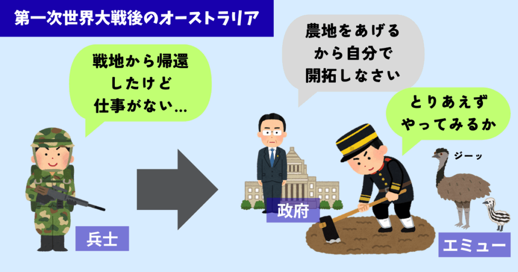 例えば以下の設問は第一次世界大戦から帰還した兵士に対して政府が新天地で農地を開拓するように推奨する内容の長文に対するものです。
